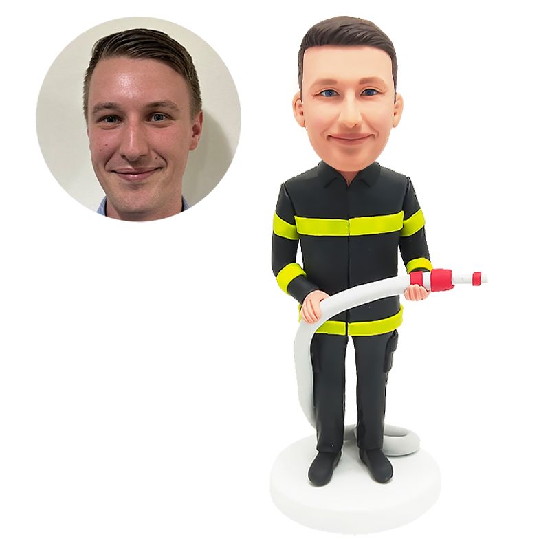 personalised bobble head figure fireman holding a fire hat with water pipe